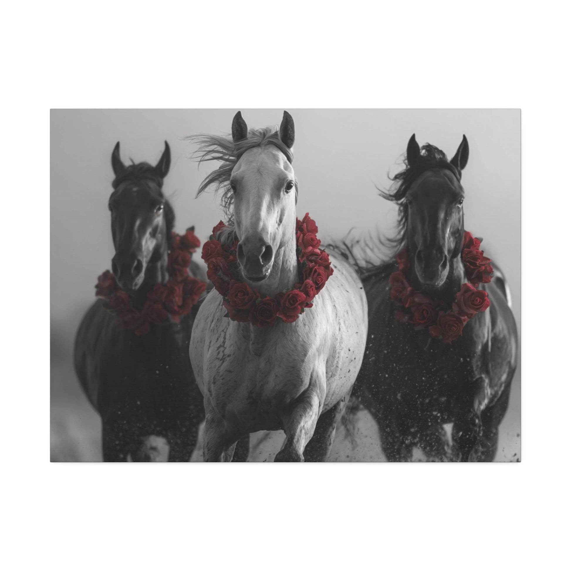 “Gallop & Glory” captures a breathtaking moment of raw movement, three powerful horses charge forward in striking black and white, adorned in vivid crimson rose garlands. The pop of red symbolizes strength, passion, and royalty, bringing high drama and timeless symbolism to this modern canvas.
