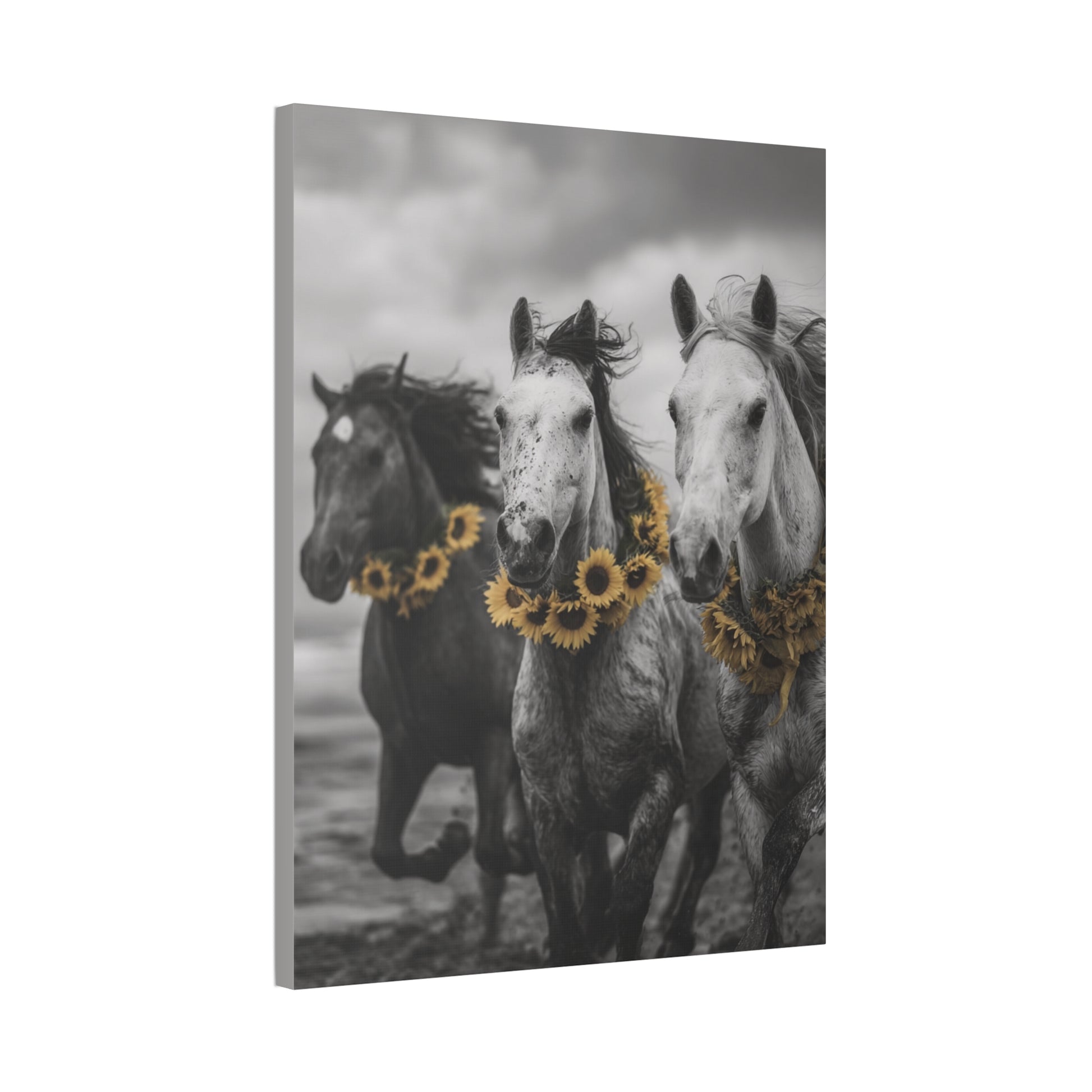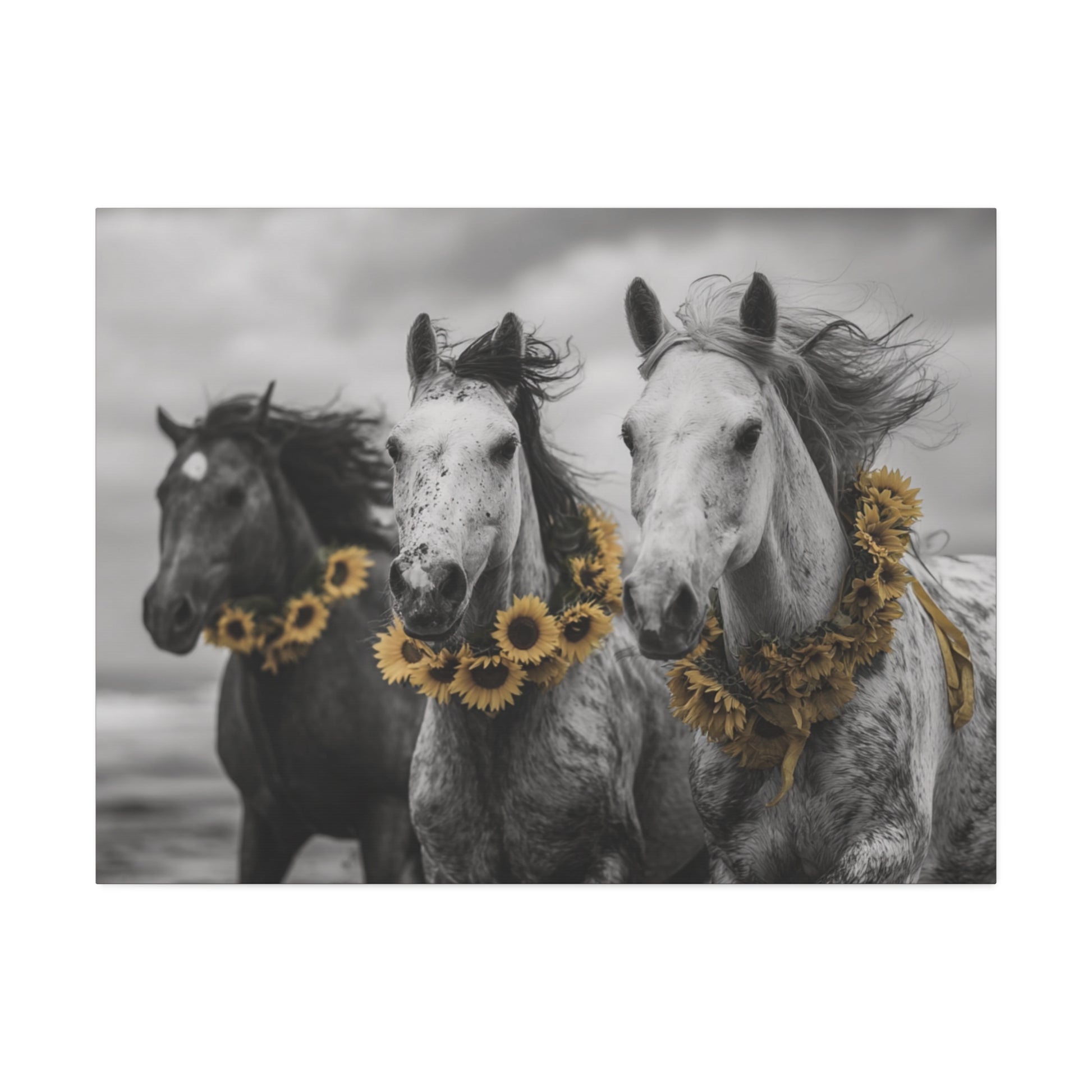 Let your walls gallop with freedom and sunshine. “Sunflower Stallions” captures the wild elegance of three spirited horses running along the shoreline, adorned with vibrant yellow sunflower garlands. This striking black and white photograph is infused with bold color pop artistry, making it a showstopper for any rustic, modern farmhouse, or equestrian-inspired home decor.