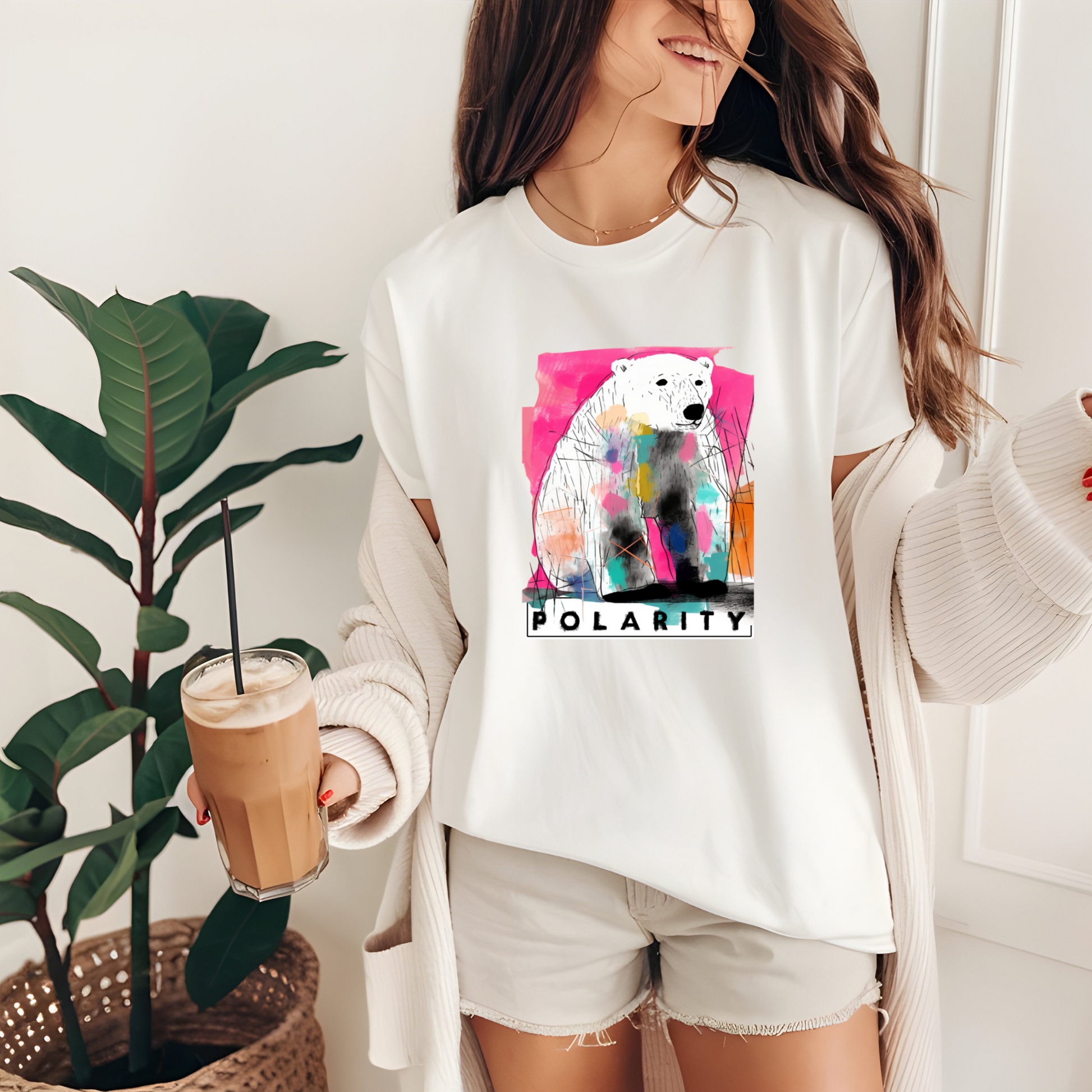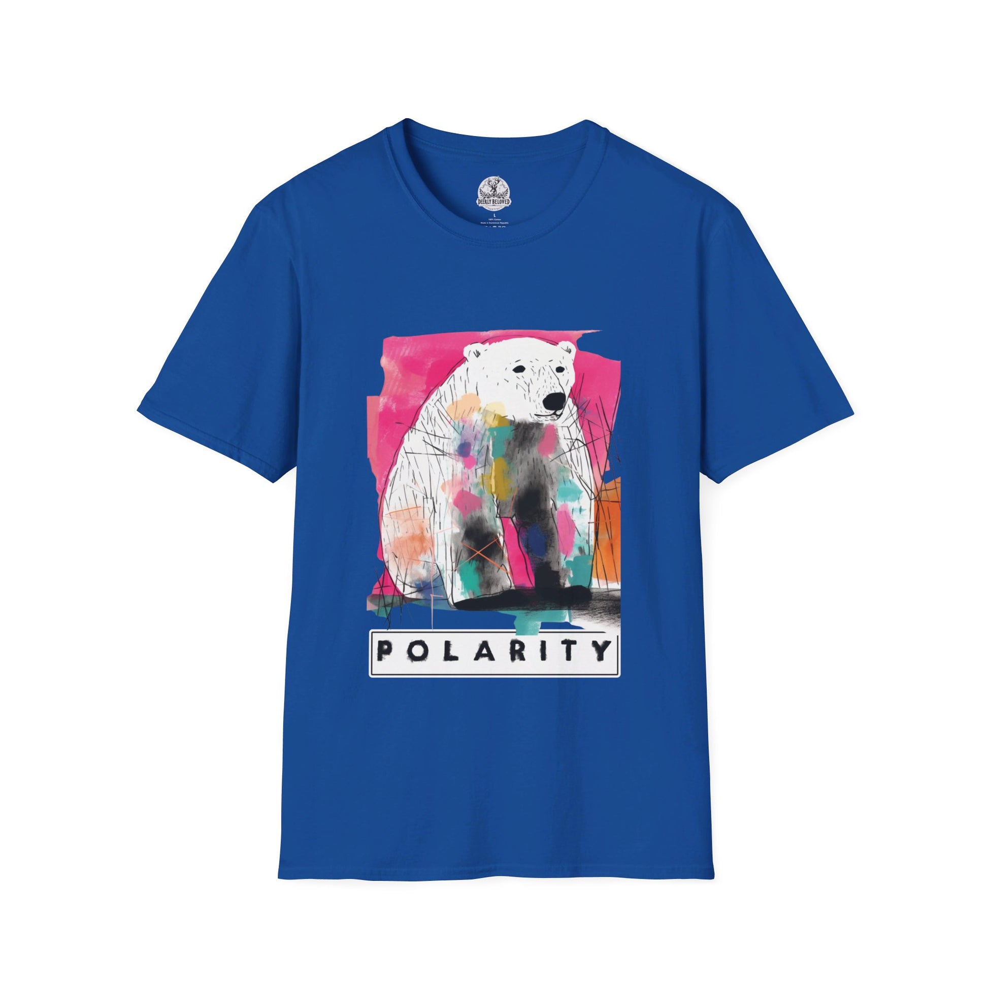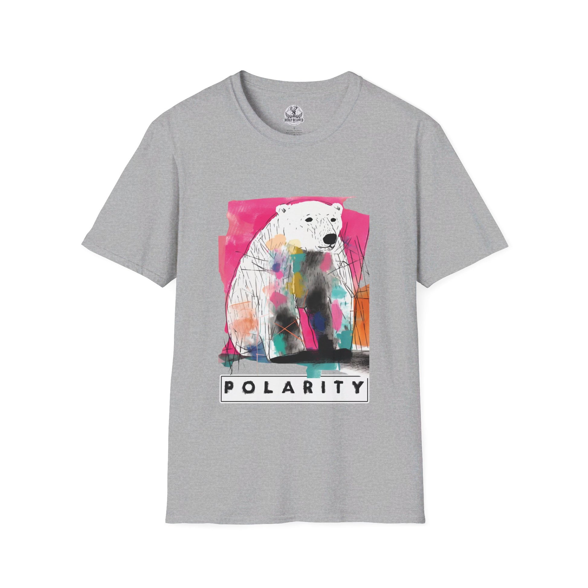Step into a world of contrasts with our "Polarity" t-shirt, an avant-garde creation that captures the delicate balance between bold expression and meaningful design. This tee showcases a striking polar bear graphic, rendered in vibrant splashes of color, playing on the dual meanings of "polarity"—the coexistence of opposites and the urgent environmental issues facing polar bears today.